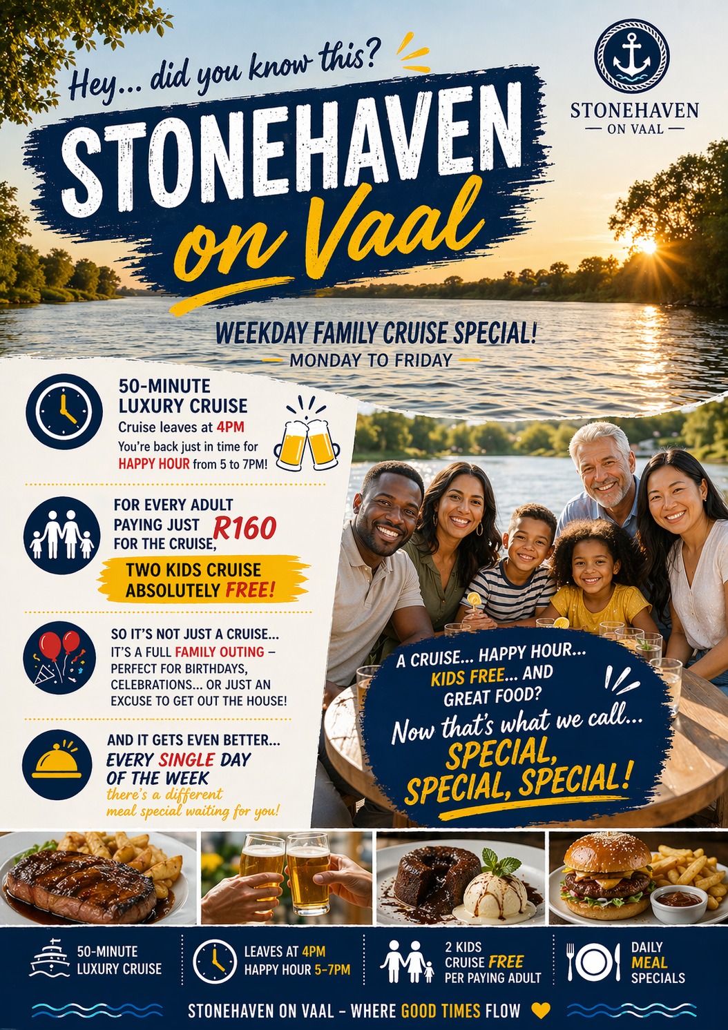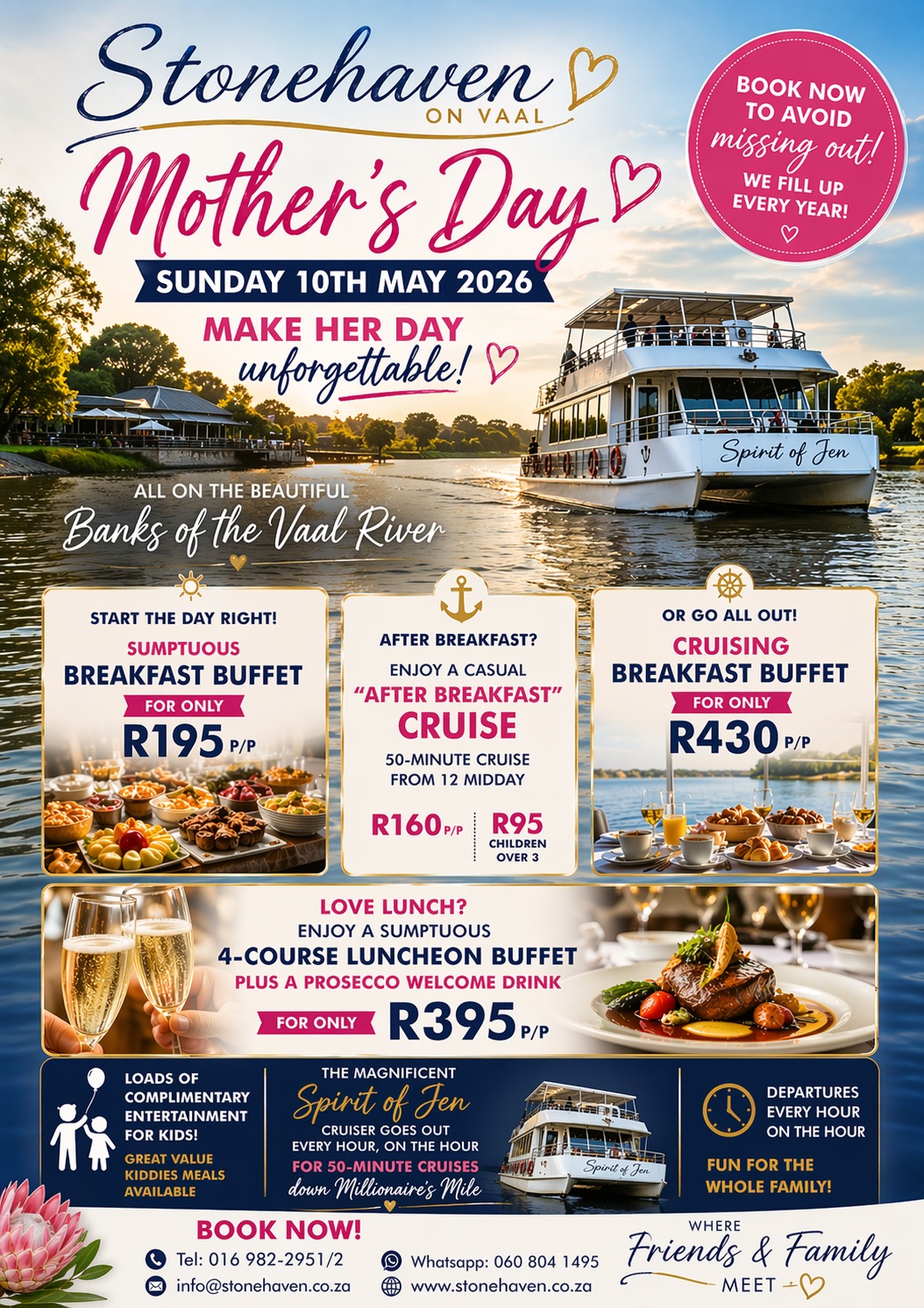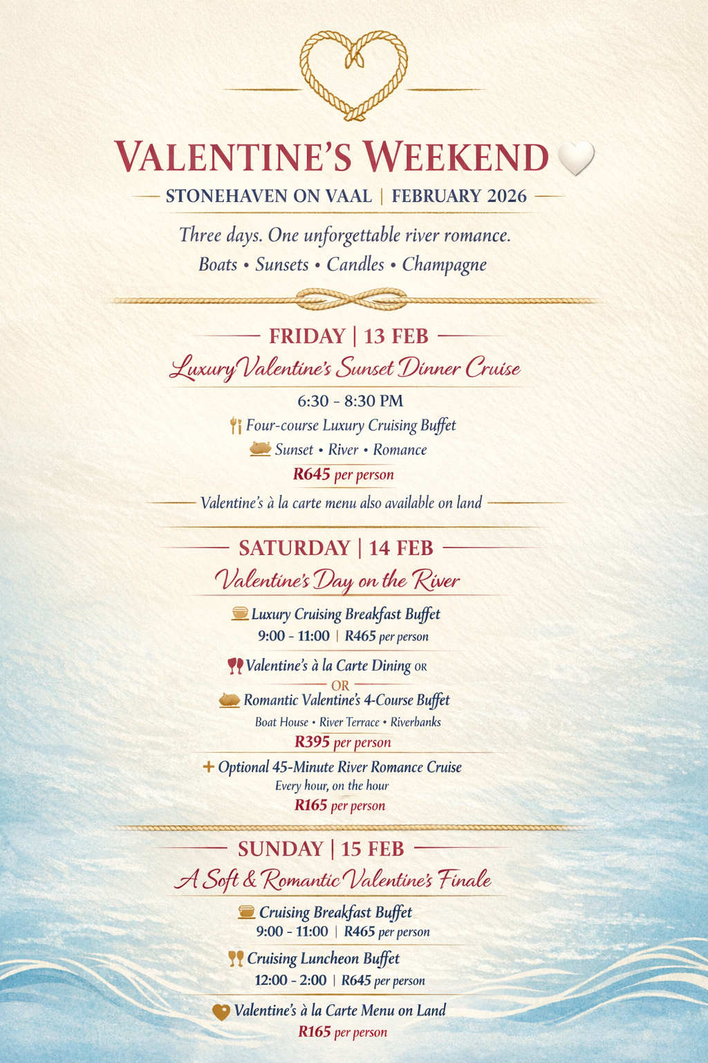 Set sail on a scenic boat cruise at Stonehaven on Vaal and experience the beauty of the Vaal River like never before. Whether it’s a romantic sunset cruise, a leisurely lunch on the water, or a fun-filled party with friends, we offer luxury cruises with delicious catering and breathtaking views.